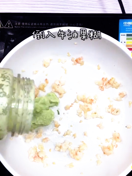 7、炒蝦戎,倒入牛油果糊,加點水,燒開。