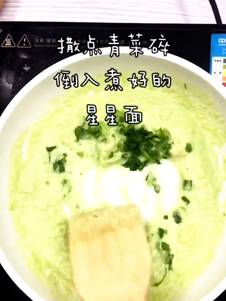 牛油果:適量、兒童星星面:適量、鮮蝦:適量、配方奶:適量、油菜(小):適量