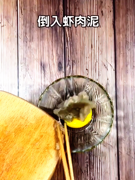 6、雞蛋只取蛋黃,倒入蝦肉泥,淀粉,鑫百味核桃油少許,攪拌上勁。