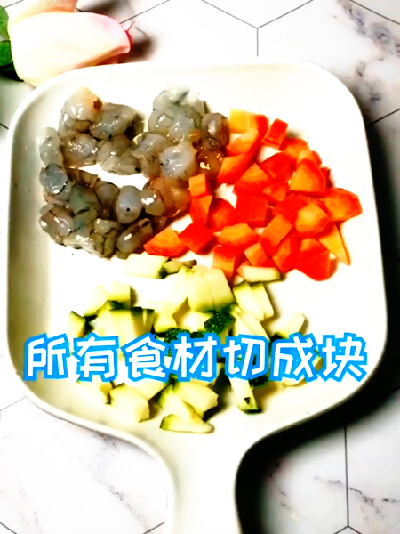 1、準(zhǔn)備食材:蝦,胡蘿卜,西葫蘆,蛋黃,玉米粉。