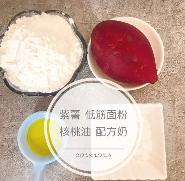 1、首先準(zhǔn)備好所有的食材,如上圖所示。小貼士:紫薯適量,低筋面粉適量,鑫百味核桃油適量,配方奶適量
