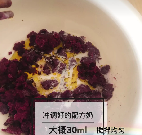 4、然后加入沖調(diào)好的配方奶,大概30ml左右,攪拌均勻